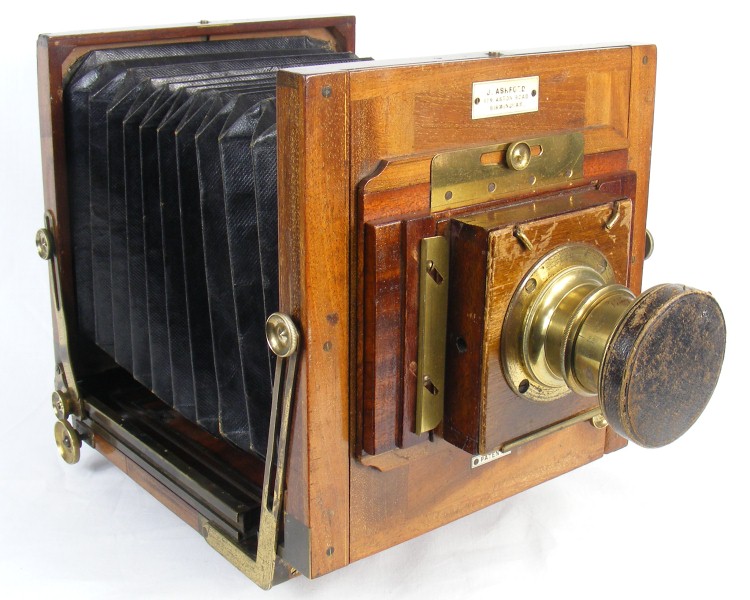 The New Patent camera by James Ashford (179 Aston Road, Birmingham) is a high quality camera, made to patent 541 (1887), which relates to a means of improving the folding of the camera. The bellows detach from the lens standard so that they can be pushed back into the rear standard. The rear standard then folds down onto the base. The front then tips back to fold down over the other components. An advantage of this design is that the lens does not have to be removed. The design also offers protection to the ground glass screen.