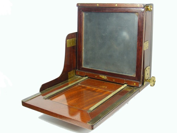 The camera is well-constructed from good quality Spanish mahogany (rich dark colouring). It is a standard tailboard design, but with a wing for stability, and fine dovetailed joints. It has a pivoted tilting back and a rising front. Square section parallel bellows in maroon leather (cloth lined), which are in very good condition.