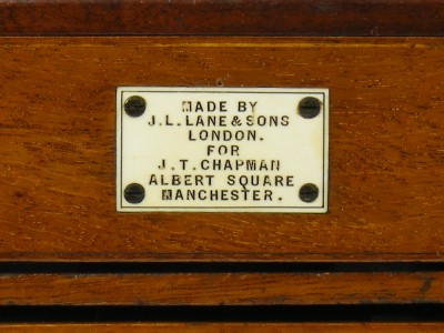 The camera bears a label that states "Made by / J. L. Lane & Sons / London / for / J. T. Chapman / Albert Square / Manchester" and on the rising front carries a further label "Scott's Patent No 12389".