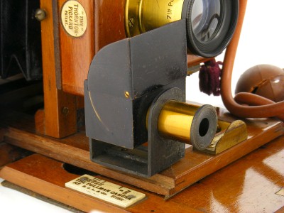 The shutter still has its pull string and toggle attached and it also has its bulb still attached, although this has dried out and split. The bellows are in very good order. The camera is equipped with a viewfinder and must be original to the camera as the drop down section door has a recess for the end of the finder lens.