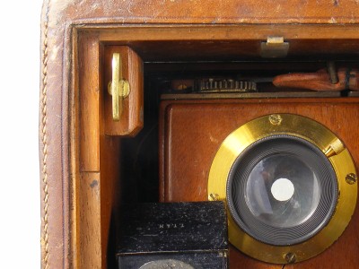 Very attractive and well built hide satchel style detective camera in ¼ plate size, with square section bellows. The Wray lens seems to be contemporary, supported by the Lens Vade Mecum [10], but this does not help date it any more closely.