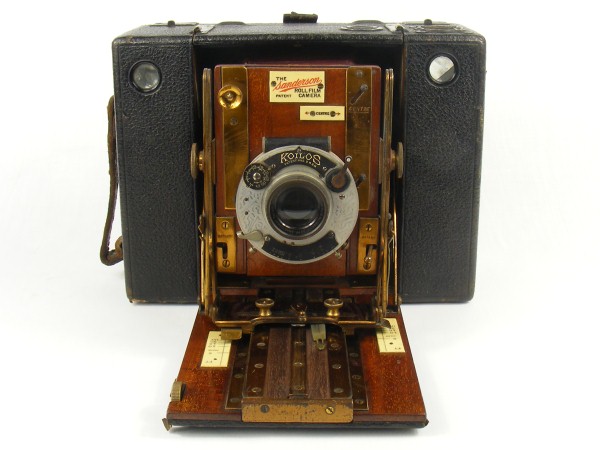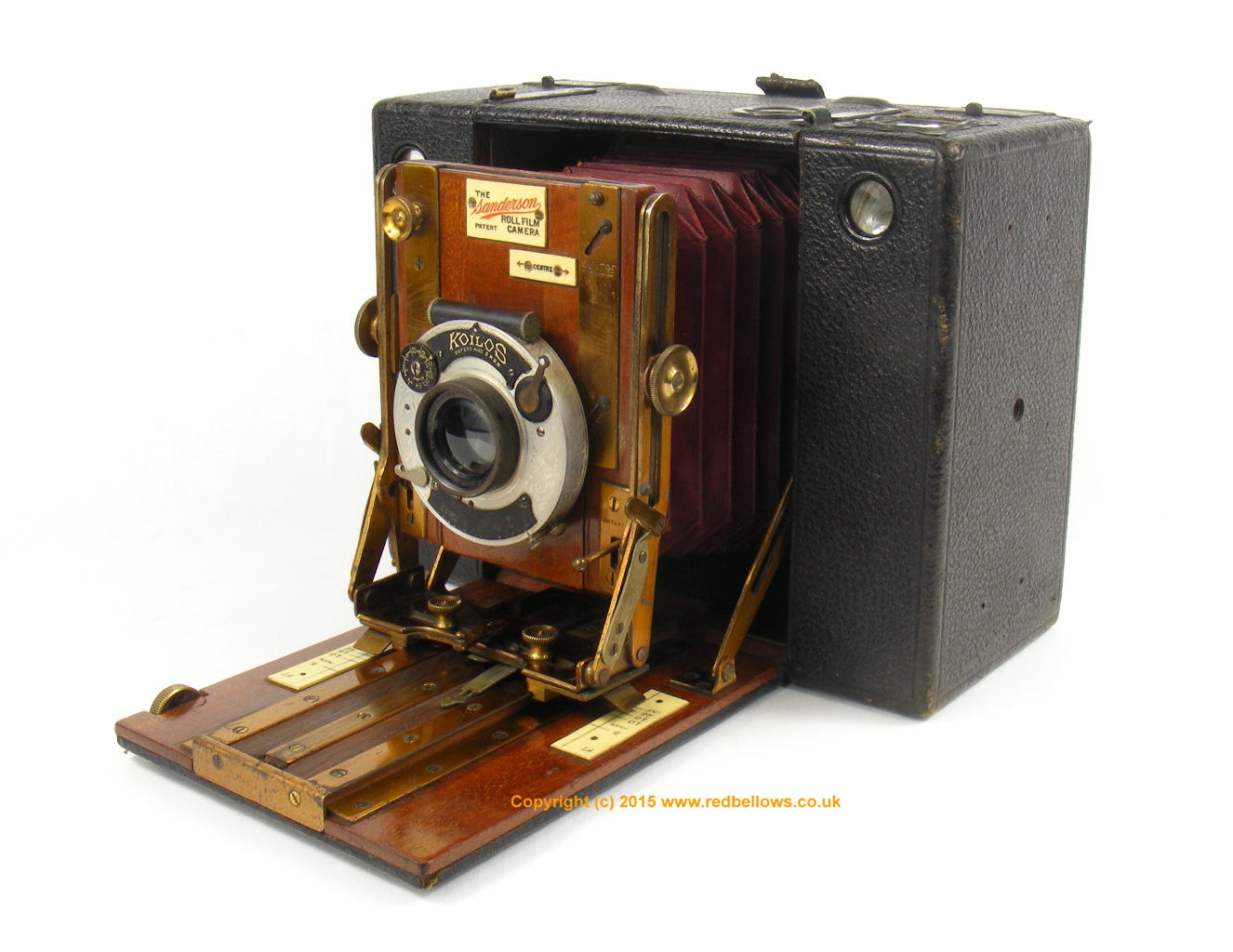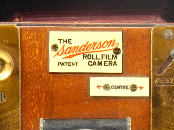 The camera model is identified on a label on the lens board as the Sanderson Roll Film camera.