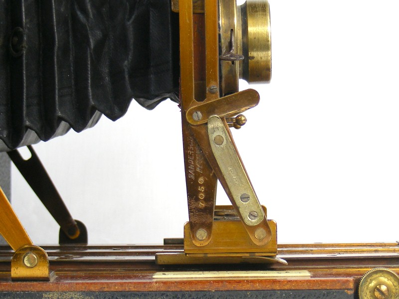 Aside of the expected Sanderson side strut mechanism that provides a full set of architectural movements, the camera also has rising and cross front. The rising front relies on a friction grip (not geared) and the cross front has two thumbscrew fixings (not just one as found on many examples). It should have two sprung steel clips to index the infinity focus position, corresponding to the settings for rollfilm or plates, but both clips are missing from this example. There are two focusing scales for the same purpose, as a consequence of the difference in the focal plane for plates and film.